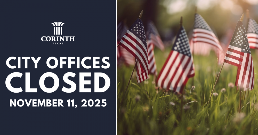 CORINTH, TX, November 4, 2025 – The City of Corinth announces that all City offices will be closed in observance of the Veterans Day holiday.